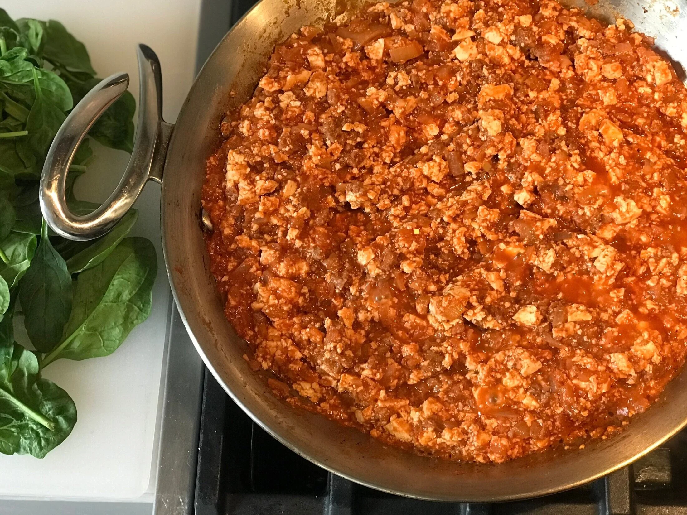 Saute’ the onion in olive oil in a non-stick frying pan on low heat until tender and golden. Add the garlic and all the spices to the pan, sauté another 2 minutes. Add the Beyond Burger patties & tofu to the pan. Use a spoon or a potato masher to break up the meatless meat & tofu so it is loose and separated (like taco meat, see picture below). Once the meatless meat is browned, around five minutes add 1 teaspoon salt, pepper, and tomato sauce. Mix everything well and continue to cook over low heat covered for about 20-25 minutes.
